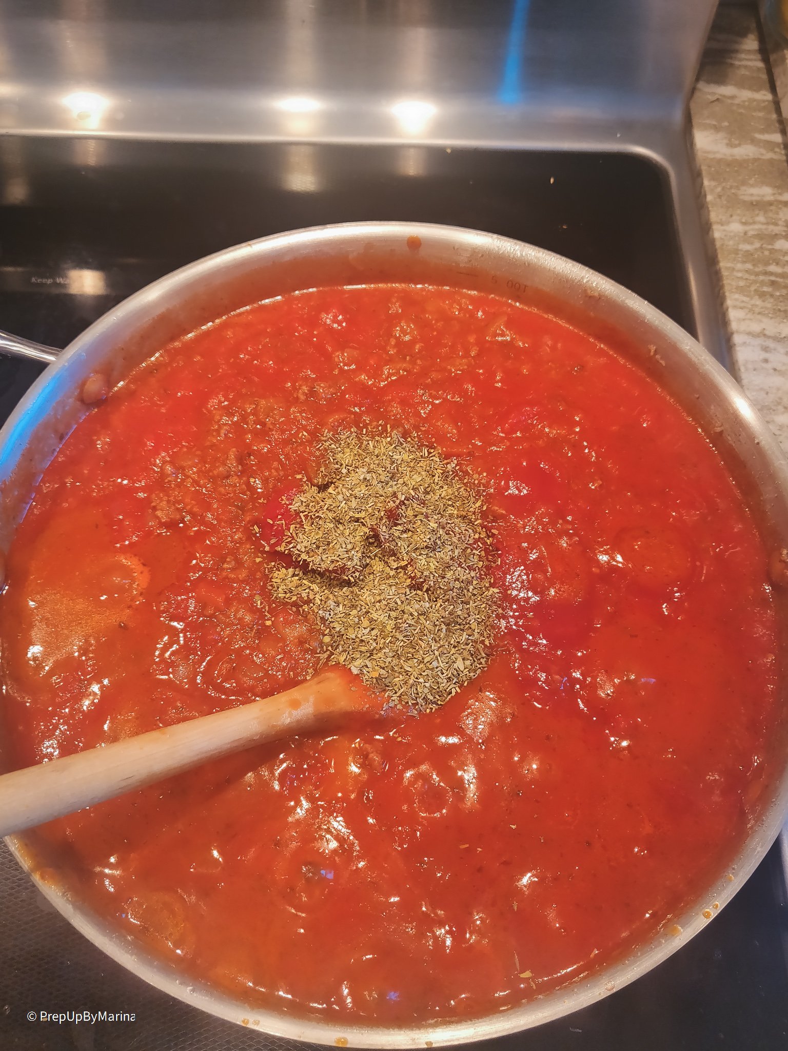 Stir in pasta sauce, tomato sauce, tomato paste, Italian seasoning, thyme. Simmer 10 minutes, stirring occasionally and add salt to taste. Remove from heat.